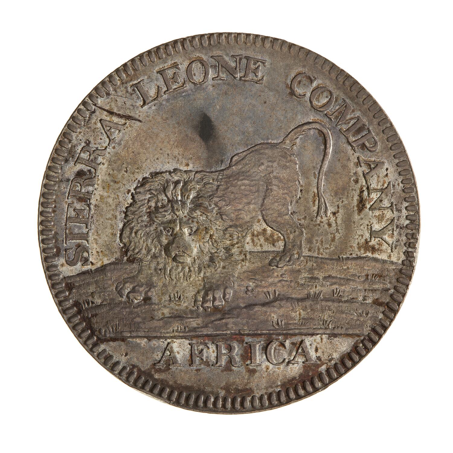 Lion on hill top facing; around above, SIERRA LEONE COMPANY; in exergue, AFRICA