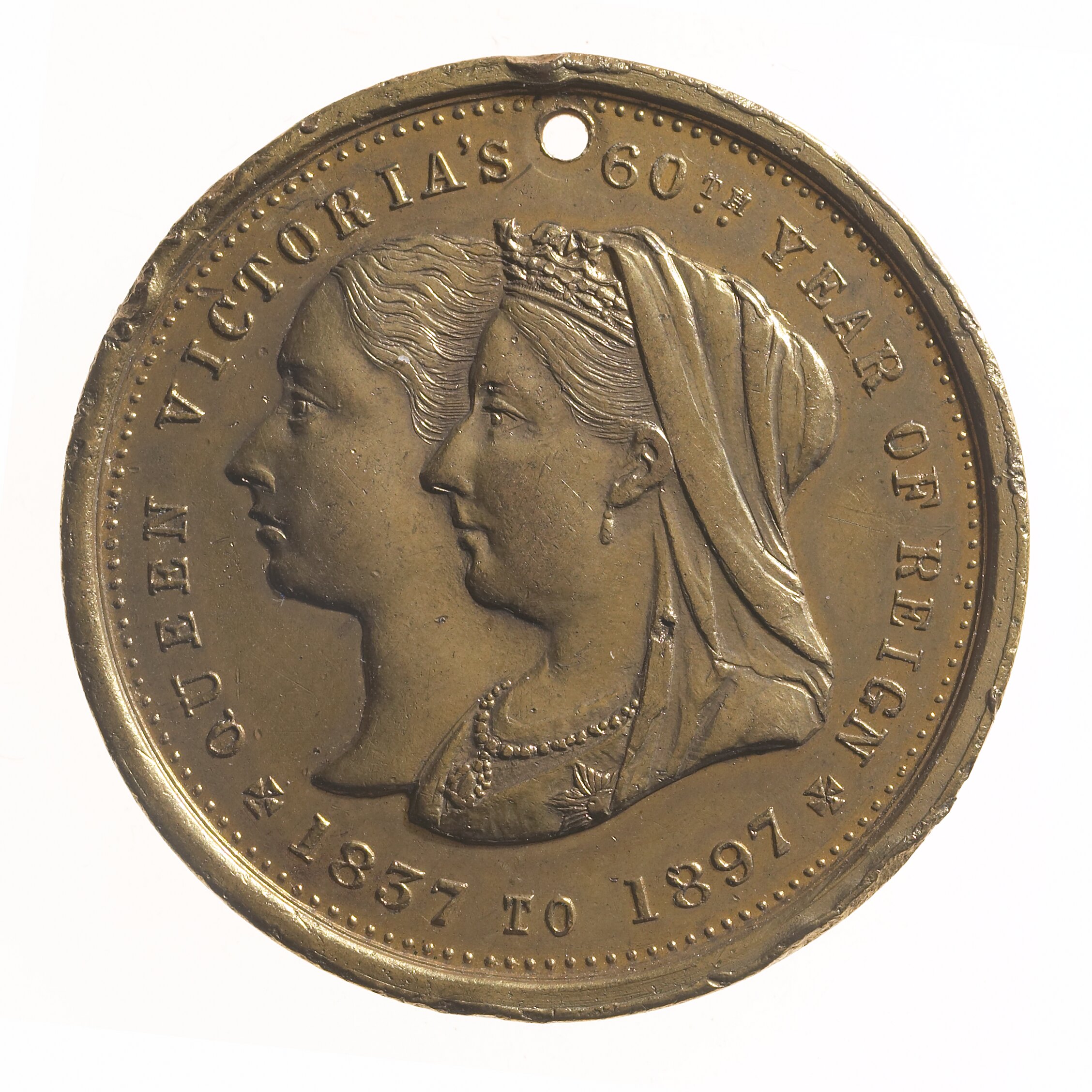 Jugate busts, young & old Queen Victoria; around, QUEEN VICTORIA'S 60TH YEAR OF REIGN * 1837 TO 1897 * (stops on either side of date in form of crosses).