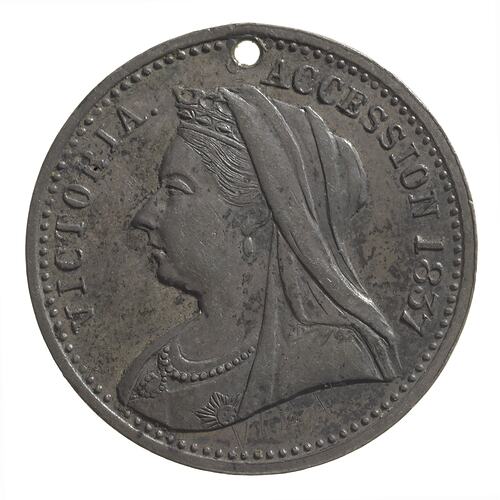 Veiled bust of Queen Victoria facing left; around VICTORIA. ACCESSION 1837