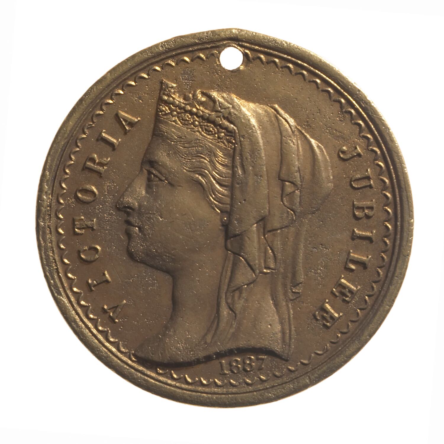 The fiftieth anniversary of the ascension of Queen Victoria was celebrated with enthusiasm throughout the Empire. This gilt medal was one of many issued by local organistions to commemorate the occasion.