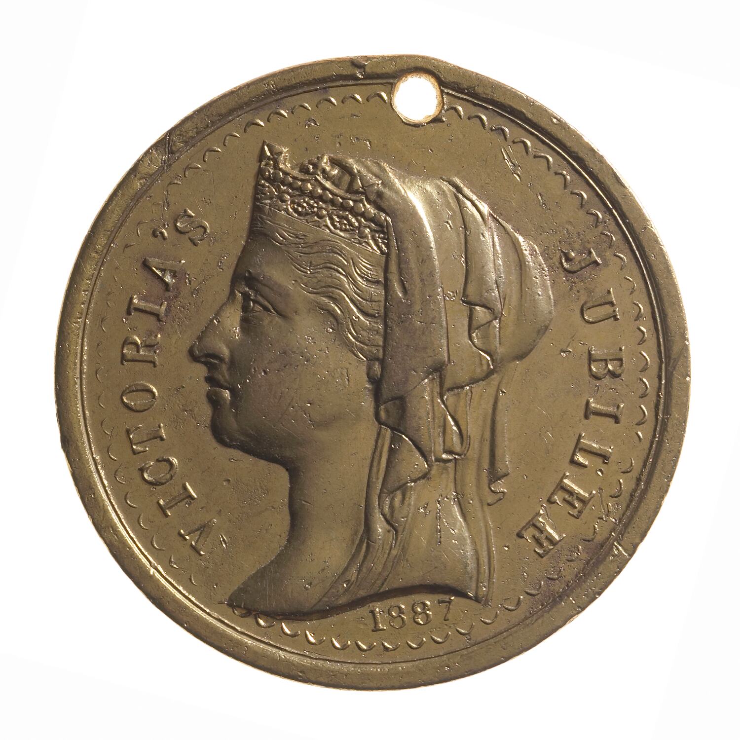 Head of Queen Victoria facing left, wearing veil and coronet; Around, VICTORIA'S JUBILEE Below, 1887. No inscription on truncation of Queen's neck.