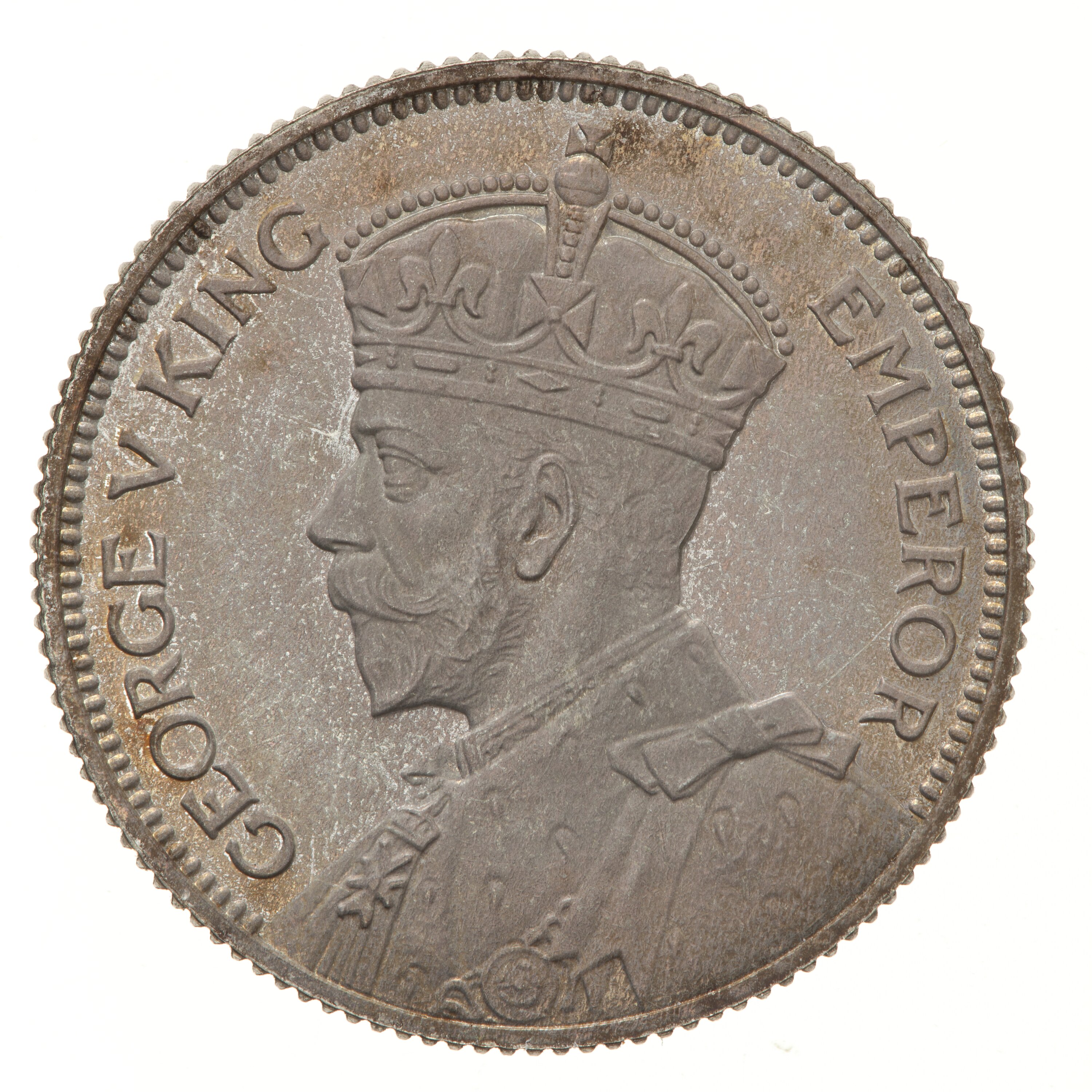 Crowned and draped bust of the King facing left; around, GEORGE V KING EMPEROR