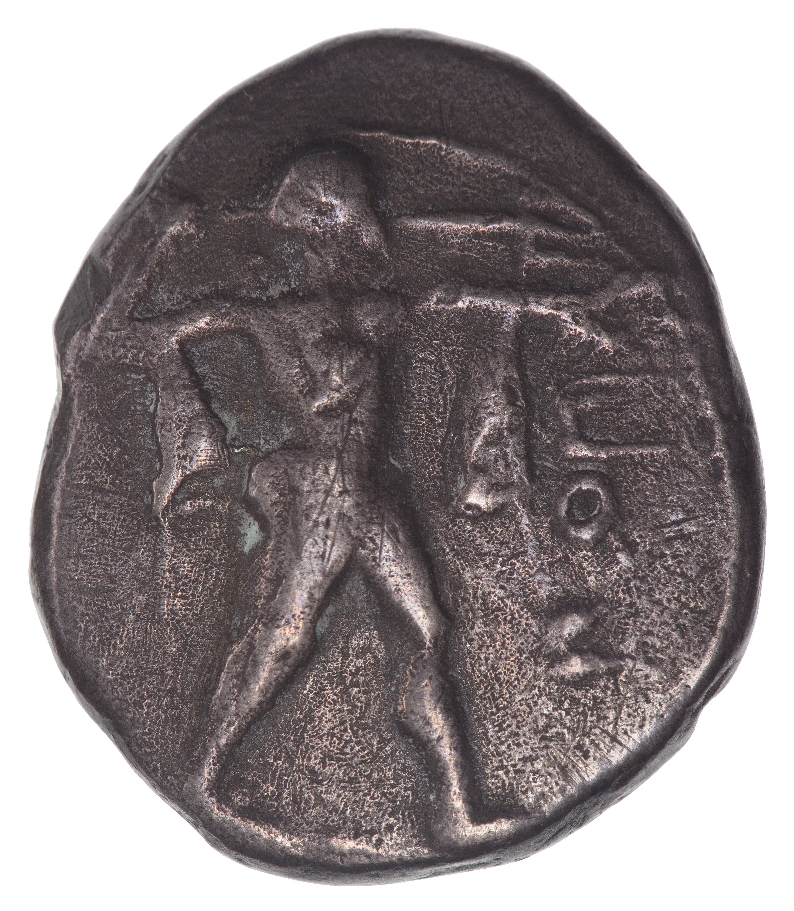 A silver didrachm (or stater) coin from the town of Poseidonia in Lucania, Italy circa 480-400 BC