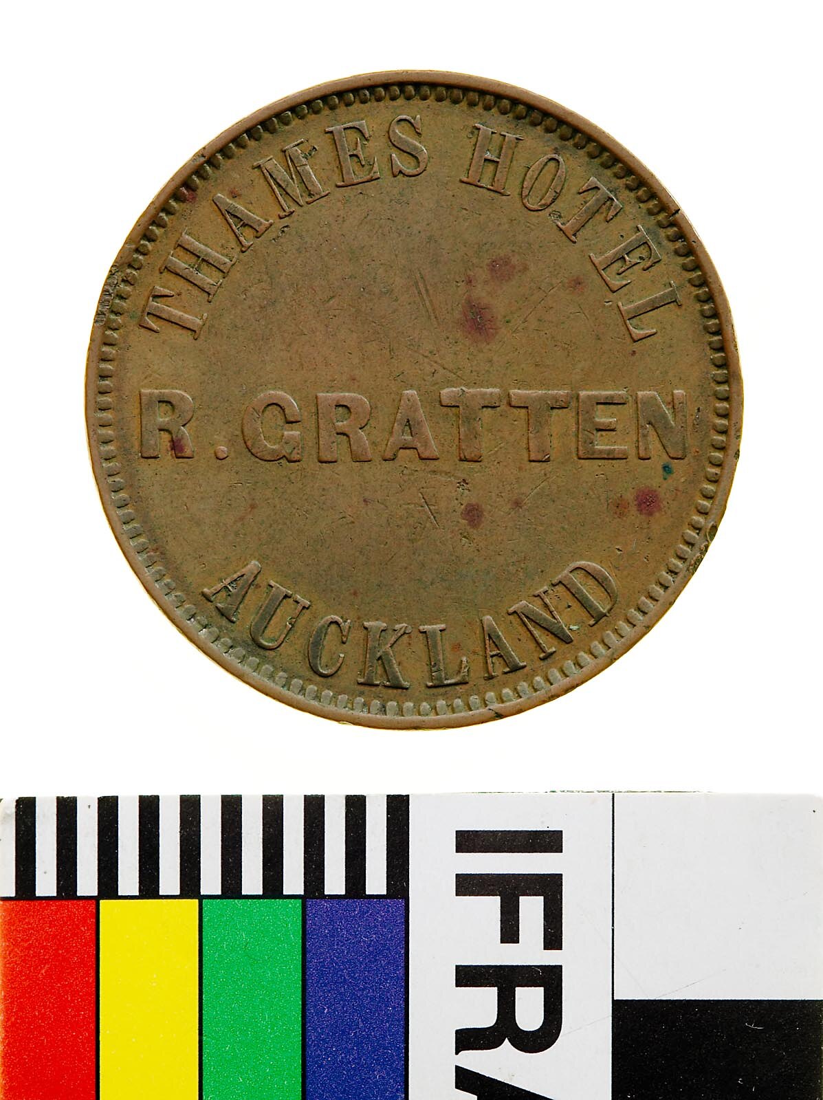 Bronze One Penny Token, mint unknown. Issued by R. Gratten, Thames Hotel, Auckland, 1872. The Thames Hotel, was run by R. Gratten in 1872. It stood at the corner of Queen and Customs Streets in Auckland. Robinson suggests that the name connects the hotel with the gold fields in New Zealand's South Island, and that fights between patrons at the end of the evening were a common event.
