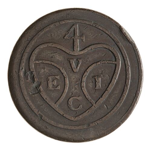 This coin is atributed to Penang as worn examples were found there up to the 1950s. It is argued that these coins accompanied Captain Light when he set out to settle the island for the East India Company in 1786, at which time the island had no accepted British name - and therefore no name was placed on the coins. They are thought to have been struck at the Calcutta mint in early 1786 but no record of there production has been found.