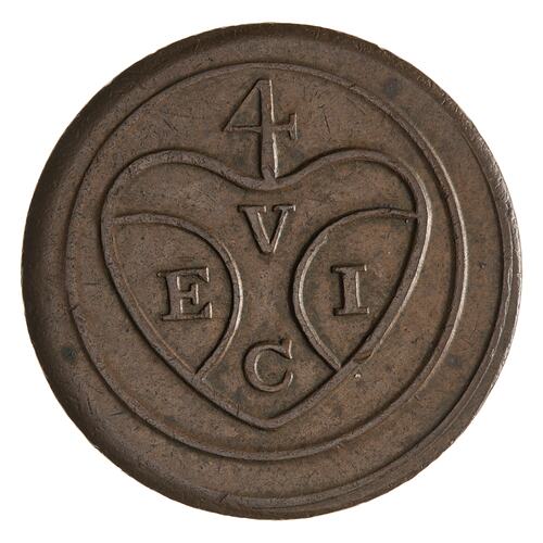 This coin is atributed to Penang as worn examples were found there up to the 1950s. It is argued that these coins accompanied Captain Light when he set out to settle the island for the East India Company in 1786, at which time the island had no accepted British name - and therefore no name was placed on the coins. They are thought to have been struck at the Calcutta mint in early 1786 but no record of their production has been found.