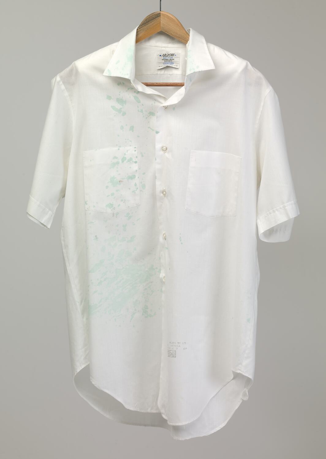 Shirt worn by an American security officers protecting US President Lyndon B. Johnson (LBJ) during his visit to Melbourne in October, 1966. During a visit to the South Yarra home of Sir Dallas and Lady Mabel Brooks President Johnson's car, and his security officers were splashed with red and green paint by several protestors.