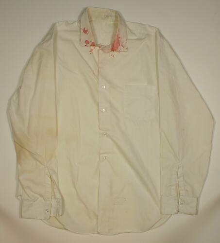 White long sleeve men's shirt with six cream plastic buttons down front. There are open pockets on both sides, at chest height. There is a manufacturer's label sewn into the back, near the collar. Red paint has been splattered across the front of the shirt, mainly around the collar (indicating that a jacket was being worn over the top of it when the splattering occured.)