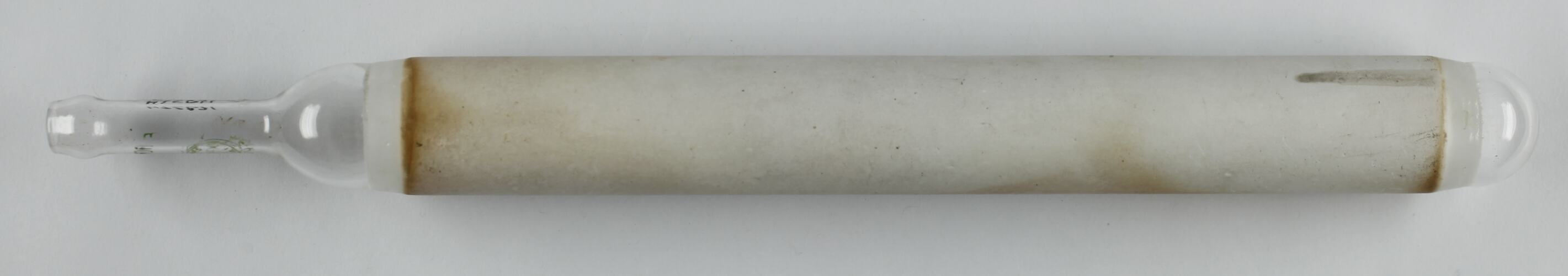 Glass tube with while coating top to bottom. Clear glass bulb at one end, narrowing to an open tube at the other.