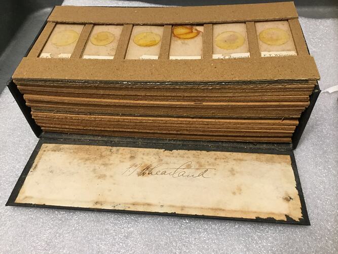 Black, cloth-bound oblong box, with detachable lid and one side hinged. Manufactured by Felton Grimwade & Co., Melbourne and signed inside by F. T. Wheatland. Individual cards inside each support six glass slides, each individually numbered and marked H. Marriott. A total of 14 cards, comprising 13 from H. Marriott and one from F. T. Wheatland.