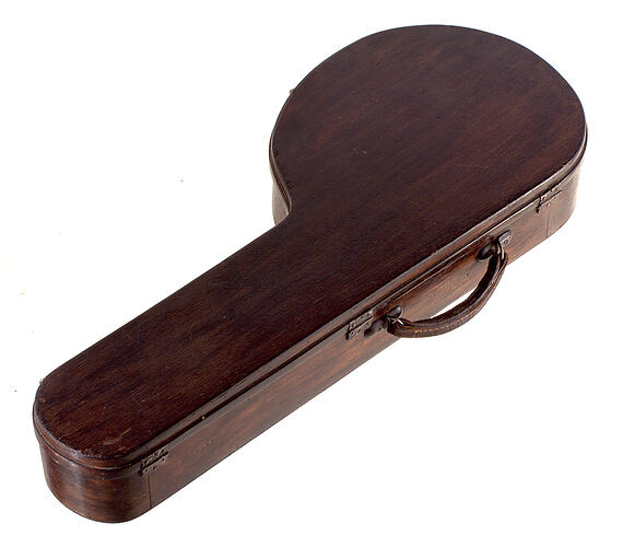 Mandolin Case for a mandolin made by Italian migrant Giovanni Cera during the 1930s. Giovanni used to visit second-hand furniture depots or music stores to seek out the timber for his instruments. He also built guitars and zithers. The name 'Cera' is inlaid on the head of the mandolin. Giovanni played this instrument at many special broadcasts for radio stations 3LO and 3AR, and appeared with Peter Piccini, Frank Zaetta, Giovanni's brother Guerino [Rino], Angelo Candela, Domenico Caffaro and Ezio Giannaccini at musical events staged in town halls, theatres and restaurants from 1930 to around 1970.