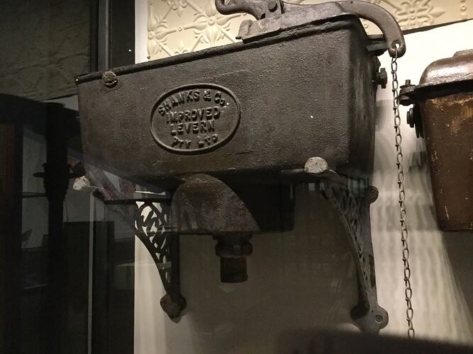 Cast-iron cistern made by 'Improved Levern', Shanks & Co Pty Ltd, circa 1900.