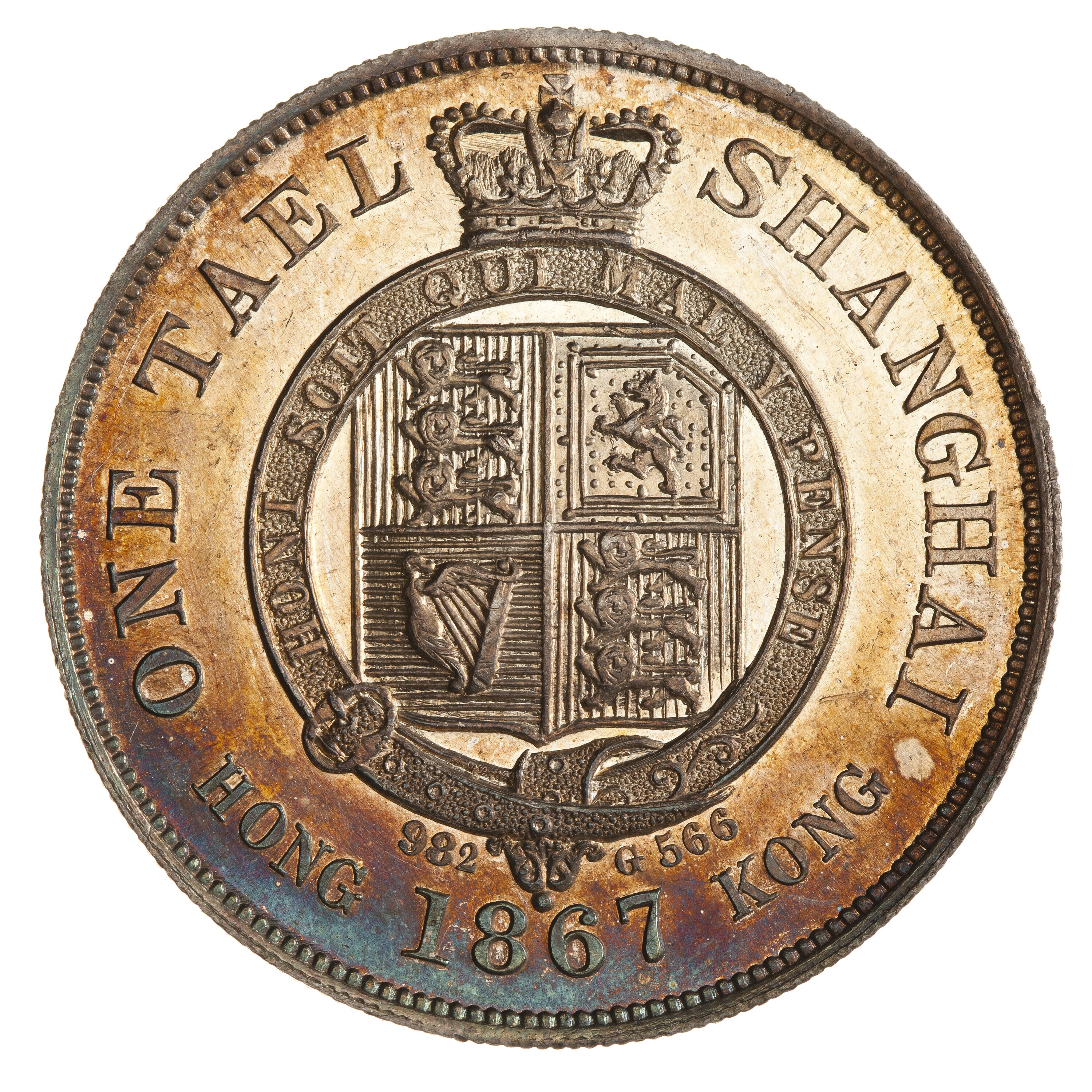 At centre crowned British Arms within garter; below 982 G 566 around, ONE TAEL SHANGHAI HONG 1867 KONG