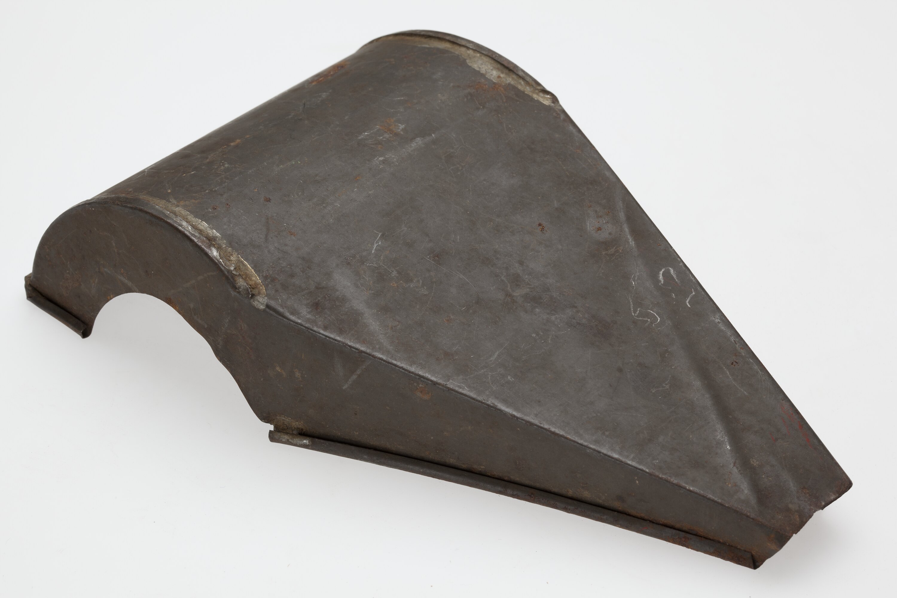 Metal chute, rounded at one end with half circular cut-outs, then narrows forming a triangular chute. The edges have been rounded.