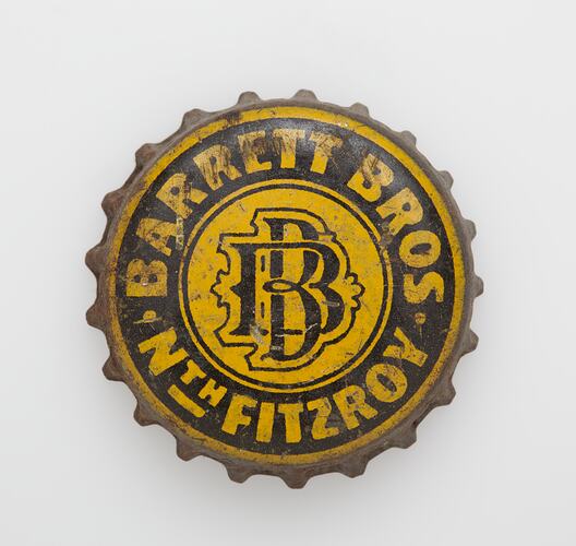 BARRETT BROS . NTH FITZROY (in yellow on black) Two interlocked B's in center in black
