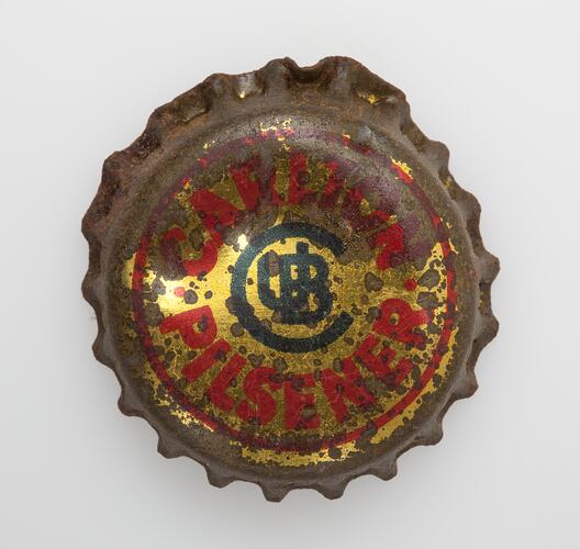 Metal bottle top. Top painted in red, gold and black. CUB logo is in the center of the lid.