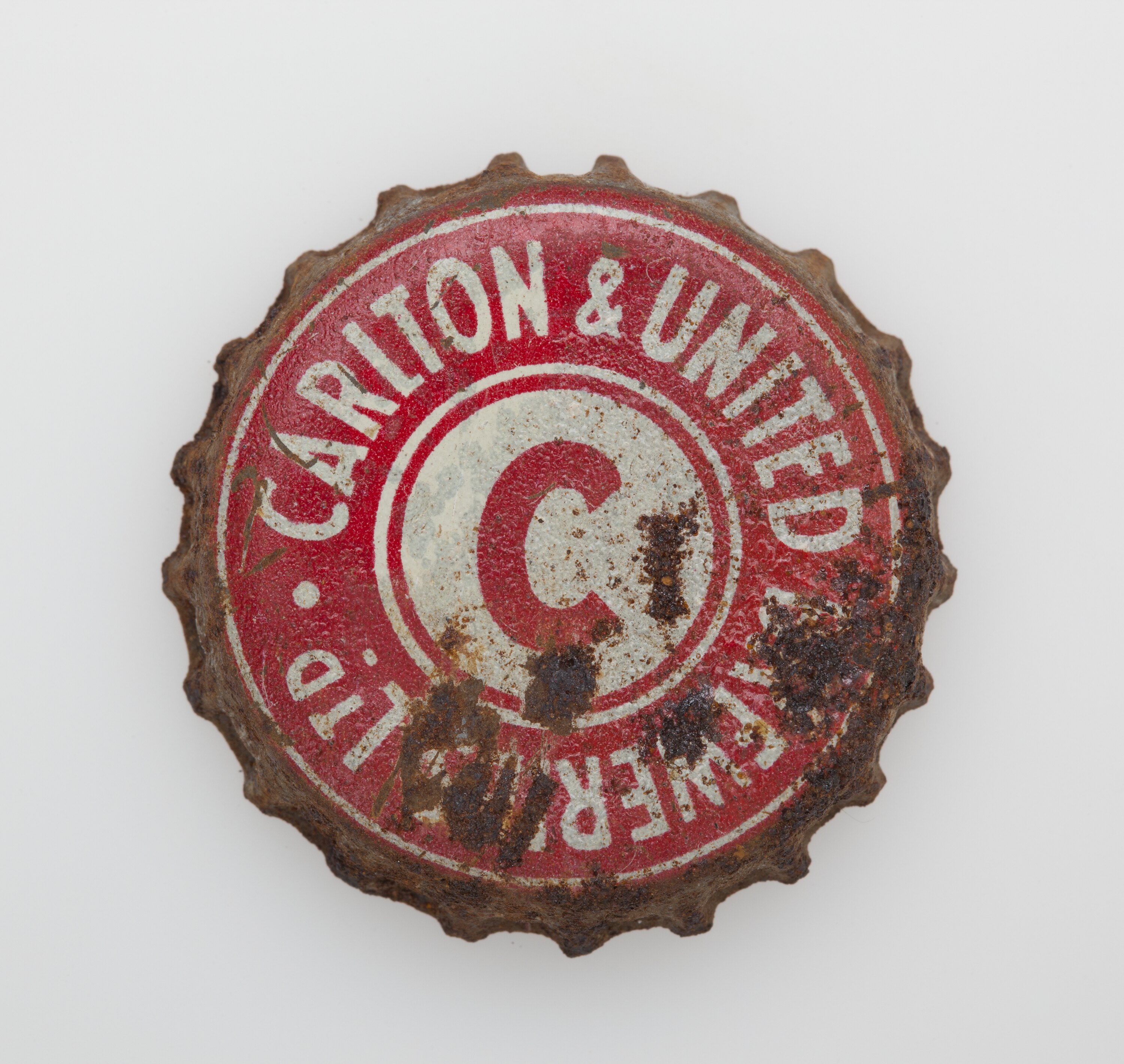 Metal bottle top, lined with cork on the inside. Top painted in red and cream.