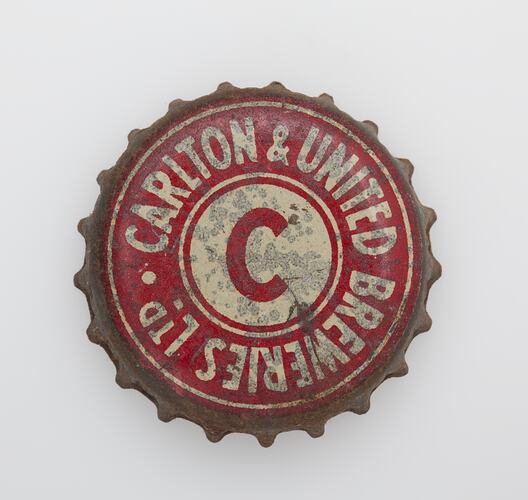 Metal bottle top, lined with cork on the inside. Top painted in red and cream.