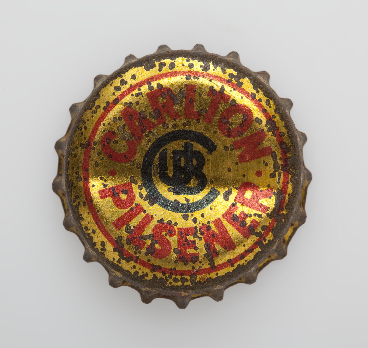 Metal bottle top. Top painted in red, gold and black. CUB logo is in the center of the lid.