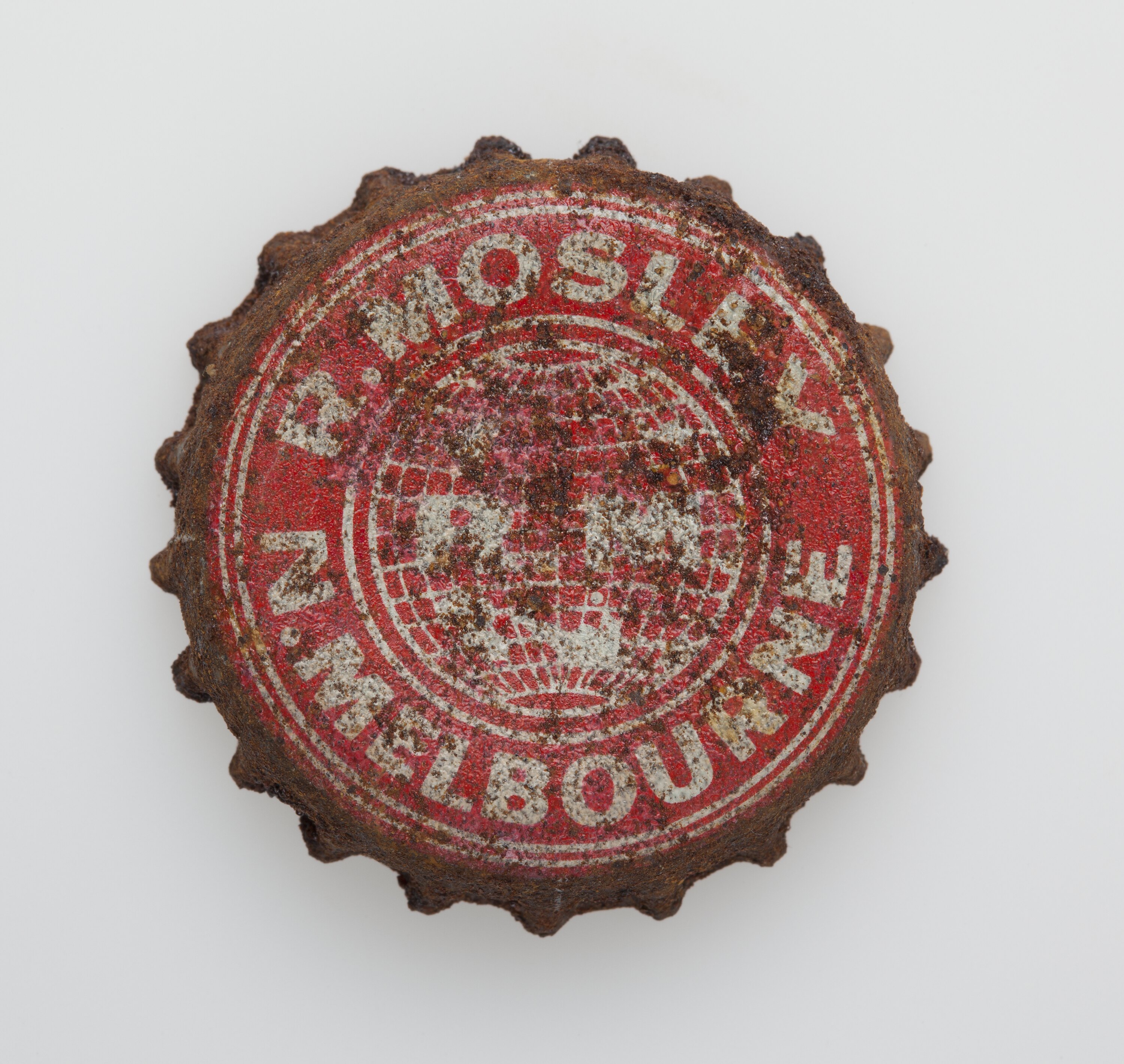 Metal bottle top, lined with cork on the inside. Top painted in red and white. Image of a cream globe in center of lid.