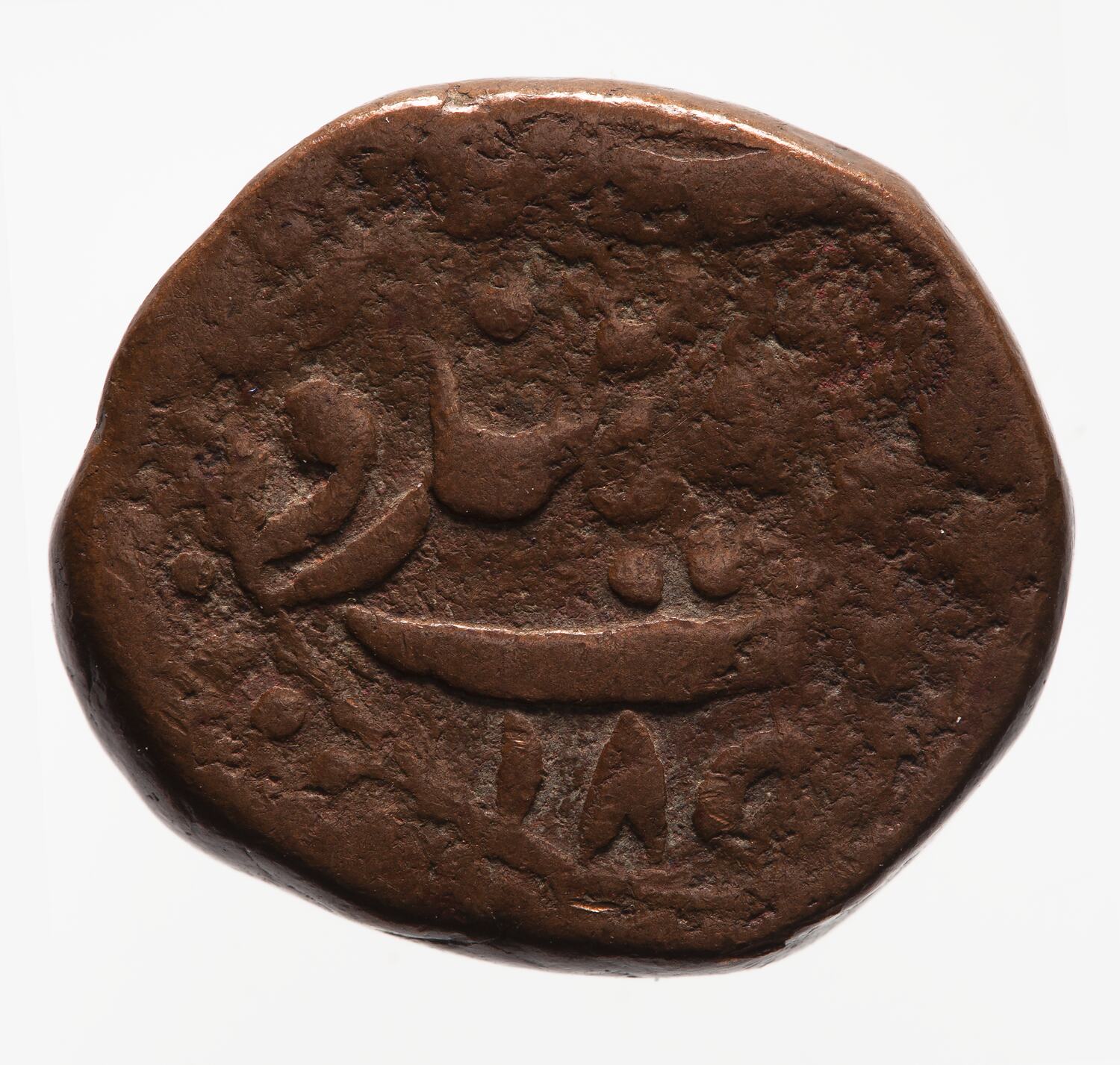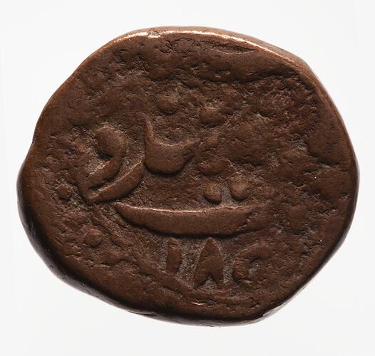 Altar-like design of mint marks; above, Persian legend (mostly, including the VS date 1916, off flan) edge of die with border of beads at lower left side with part of the AD date 185[9]