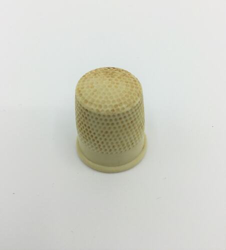 Cream-coloured plastic dimpled sewing thimble.