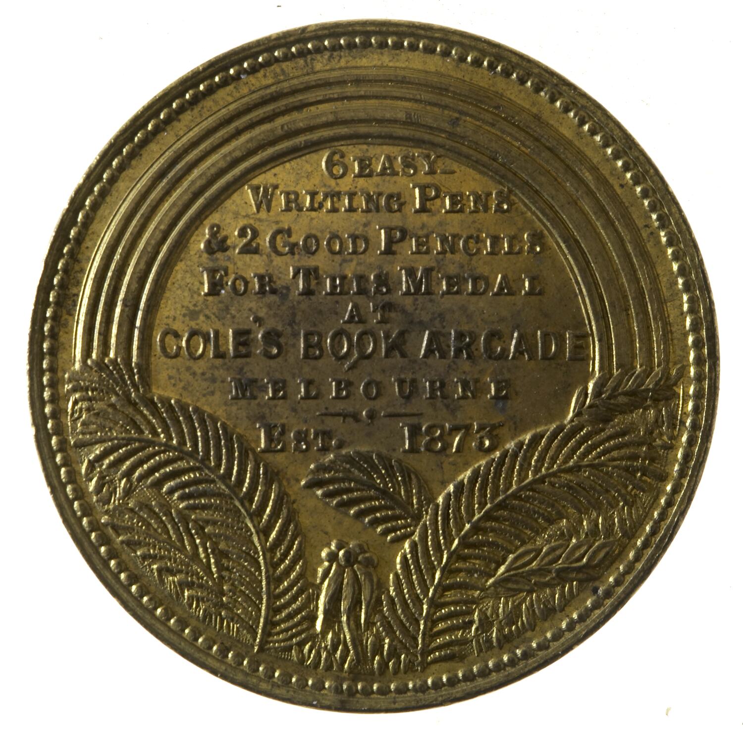 Ferns from which spring a rainbow; below rainbow, 6 EASY / WRITING PENS / & 2 GOOD PENCILS / FOR THIS MEDAL / AT COLES BOOK ARCADE / MELBOURNE / EST. 1873