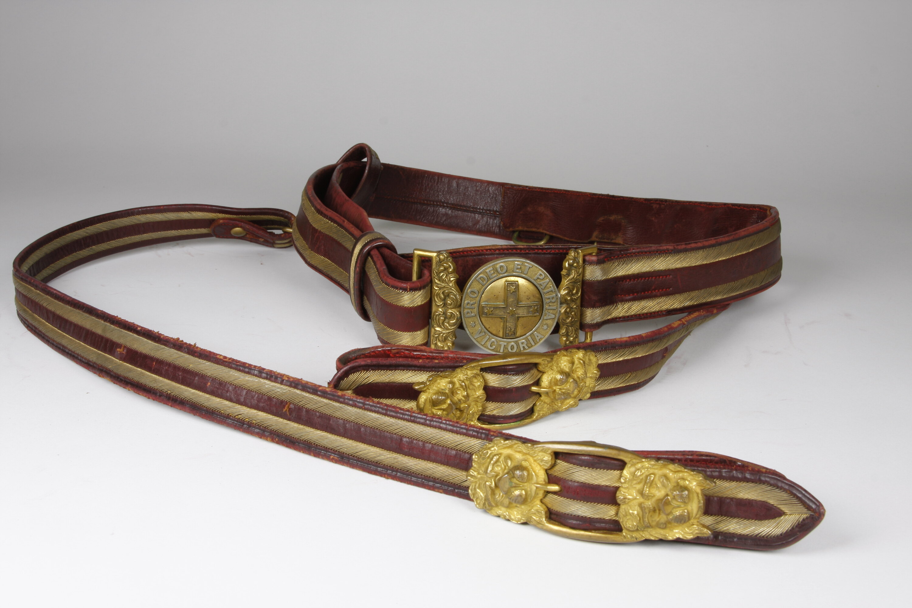 Red leather belt with two bands of gold wire stitched around upper and lower edges. Simple brass loop to adjust length. Circular buckle with Victorian cross and stars surrounded by motto, attached to belt with stylized floral clasps. Two red leather sword slings with gold wire stitching along edges, attached to the belt; one on a simple brass loop, the other with a red leather and gold wire stitched loop. At the end of each sling is a buckle with a lion's head at each end. A further three brass loops on the underside of the belt, to allow the slings to be moved.
