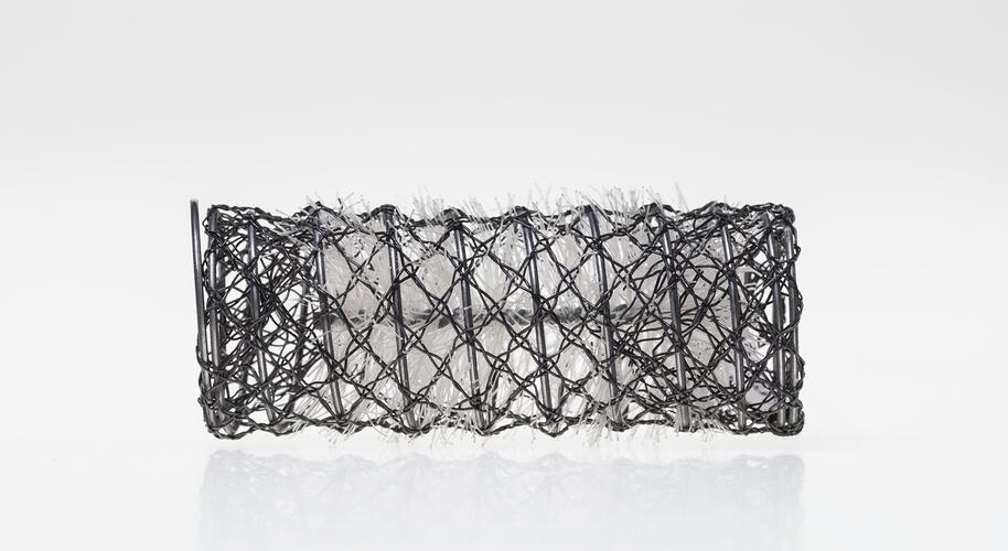 Wire mesh brush hair roller. One of a mixed collection of hair rollers, made circa 1950-1969. The rollers were used by the donor's mother, Mrs Everly (nee Ms Loughlin). After completing her apprenticeship, Ms Loughlin used the rollers in her hairdressing business in Yarraville and later in private practice at her home.