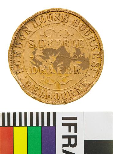Within plain circle superimposed above scrollwork, S.DEEBLE / DRAPER around, : LONDON HOUSE BOURKE ST. : MELBOURNE. This token shows the effects of clashed dies with additional lettering reversed in the lettering of LONDON HOUSE BOURKE