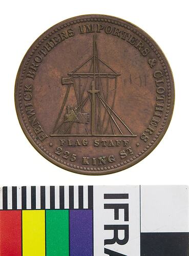 Obverse: FENWICK BROTHERS IMPORTERS & CLOTHIERS 225 KING ST. FLAG STAFF Reverse: 225 KING STREET MELBOURNE VICTORIA