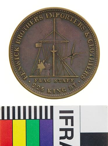 A round copper token (34 mm diameter) giving the name address and business of the issuer: Fenwick Brothers, 225 King Street, Melbourne, Importers and Clothiers. The obverse features a view of Observatory House beside a large flagstaff with cross stays, ropes etc. A single flag, divided horizontally with the top half shaded in vertical lines and the bottom plain (red and white), flies from the left side of the flagstaff. The reverse features a profile portrait of Queen Victoria. There is a large "X" shaped scratch on the obverse.