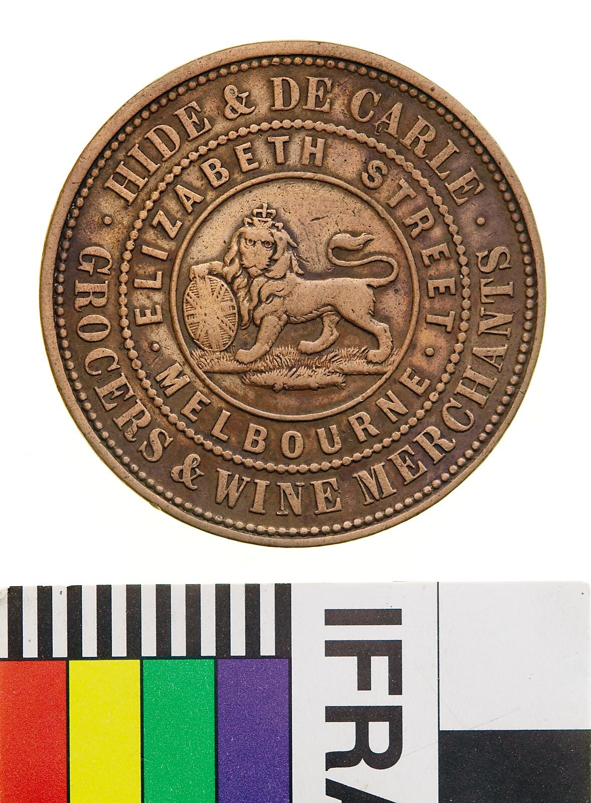 At centre within two concentric rings of text devided by a beaded circle, a male lion standing to left with head crowned facing front, its right paw is raised and rests on a shield bearing the Union Jack, its tail curved back over its body. Around, .HIDE & DE CARLE. GROCERS & WINE MERCHANTS / . ELIZABETH STREET . MELBOURNE