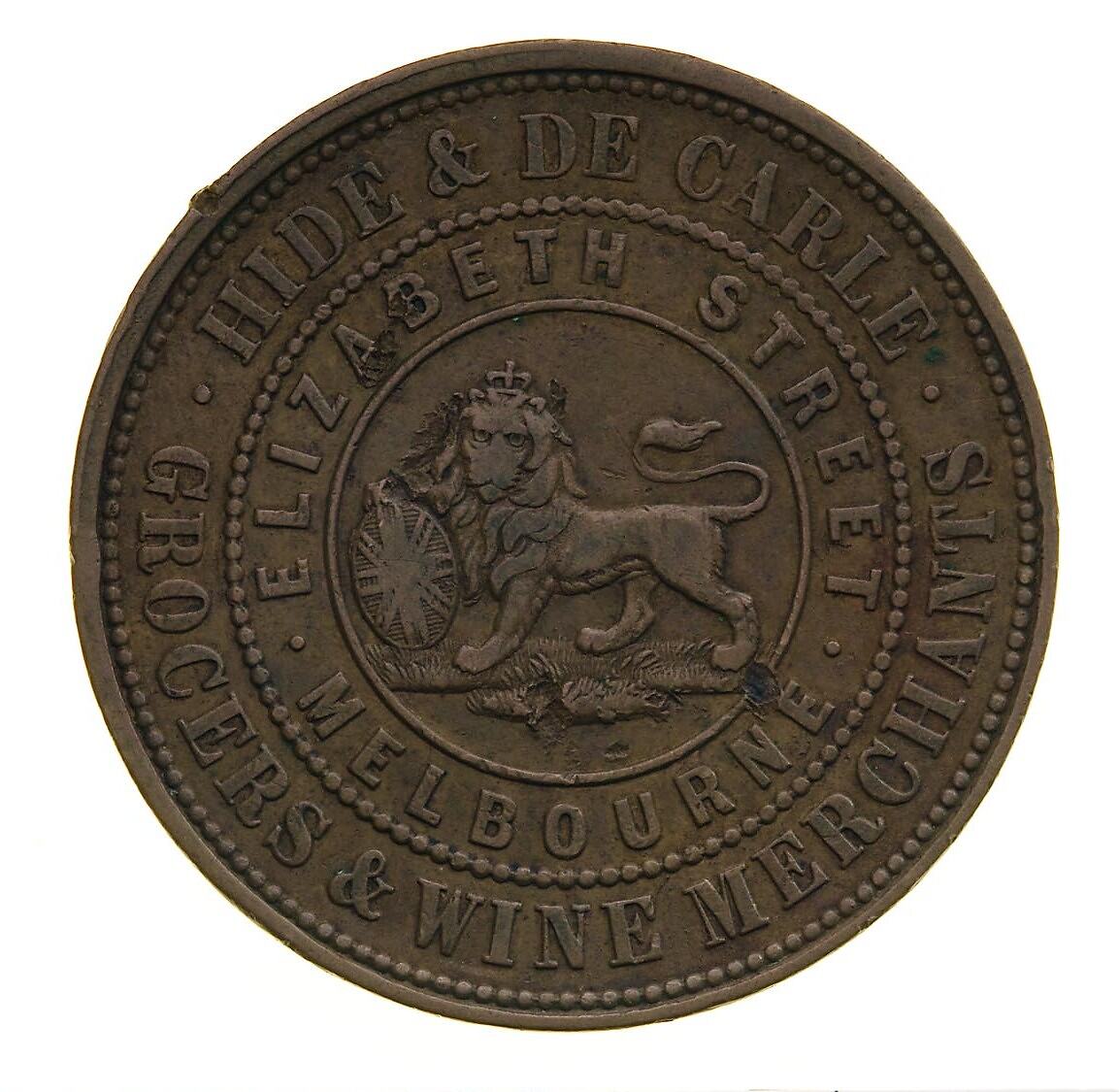 Obverse: HIDE & DE CARLE. GROCERS & WINE MERCHANTS ELIZABETH STREET MELBOURNE Reverse: MELBOURNE, VICTORIA. 1857