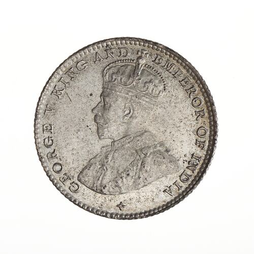Bust of the King wearing the Imperial crown and an ermine robe with the collar of the Garter; around, GEORGE V KING AND EMPEROR OF INDIA; the artist's initials BM on bust truncation