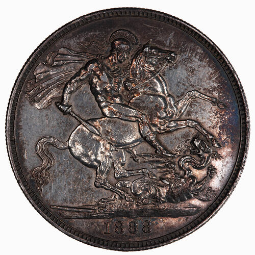 St George on horseback advancing to right wearing a helmet and cape and holding a sword; below horse, fallen dragon with lance in its side; below exergue line at right the artist's initials B.P. (Benedetto Pistrucci); in exergue, 1888