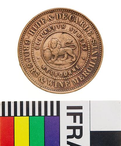 A round copper token (34 mm diameter) giving the name address and business of the issuer: Hide & DeCarle, Elizabeth St. Melbourne, Grocers and wine merchants.. The token features at centre of the obverse a male lion standing to left with head crowned facing front, its right paw is raised and rests on a shield bearing the Union Jack, its tail curved back over its body. On the reverse a female figure representing Justice seated on a wool bale with legs to left but her head and upper body to front. A wine barrel lies on the ground behind her, its end decorated with a cross to hint at a Union Jack (as found beside Britannia on the copper coins of the period). A three-masted sailing ship sails to the right on the horizon to the left. Justice wears a blindfold and extends a balanced set of scales with her right hand. With her left she holds an inverted cornucopia from which fruits flow onto the ground. She wears an ancient-style of flowing dress bound at the waist, her left arm bare and right draped to near the elbow. It bears the date 1857. This token has been cleaned and the reverse has re-toned.