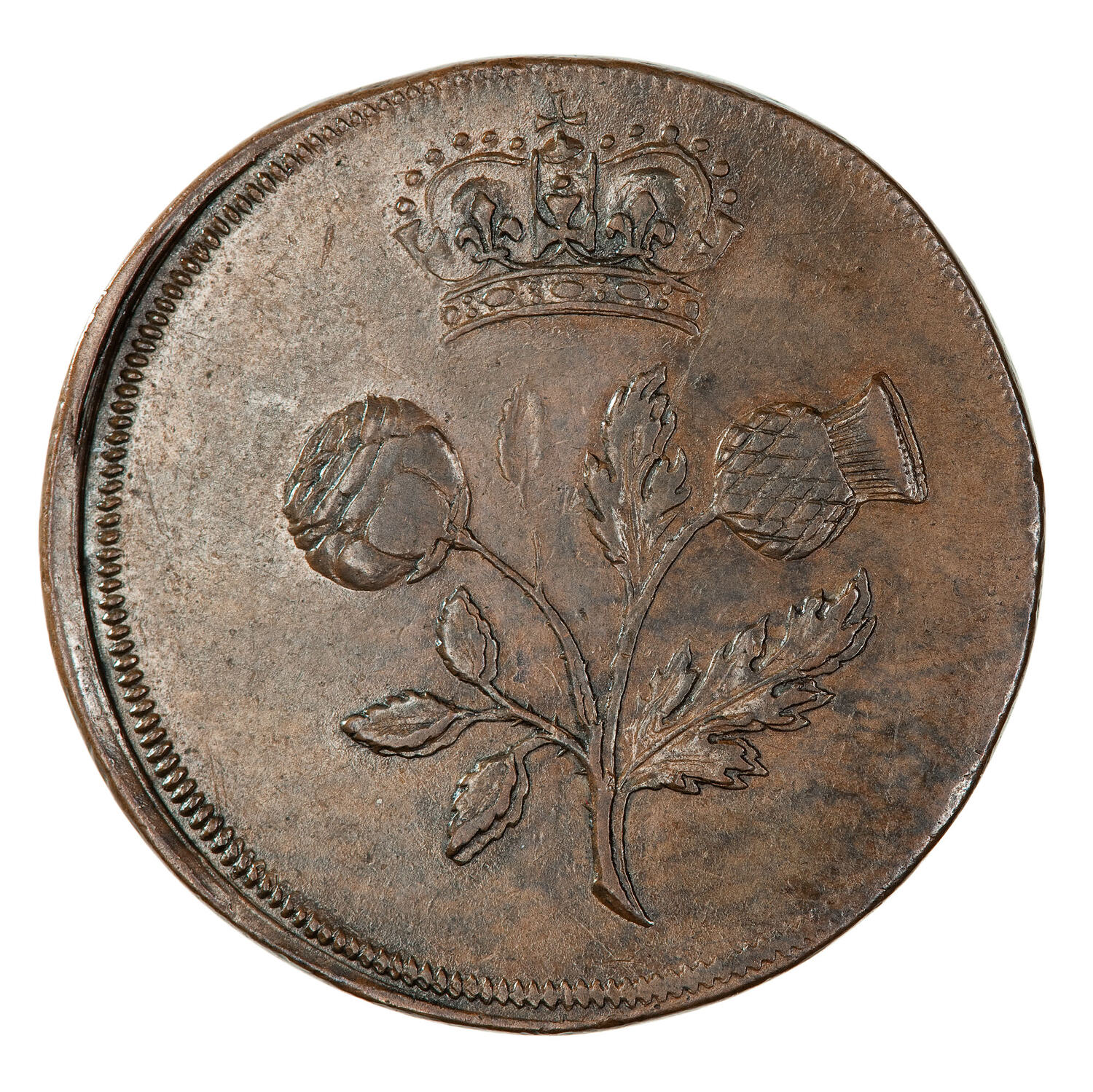 Draped bust of Queen Anne facing left; around, ANNA D G MAG BR FR ET HIB REG (translation: Anne by the Grace of God Queen of Great Britain, France and Ireland)