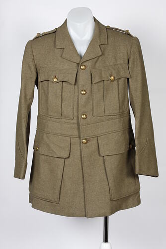 Khaki woollen tunic, part of an Australian uniform, Australian Army Medical Corps, 1914-18, worn by Lieutenant-Colonel John Hodgson Nattrass, 2nd Field Ambulance.