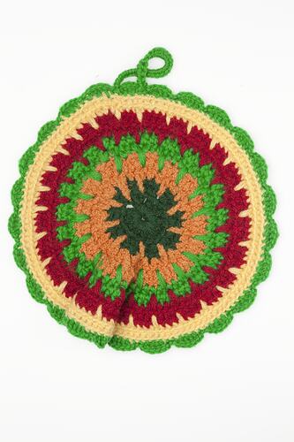 Crotched woolen circular pot holder. With a pattern made up of concentric circles in green, yellow, red, green, orange and dark green.