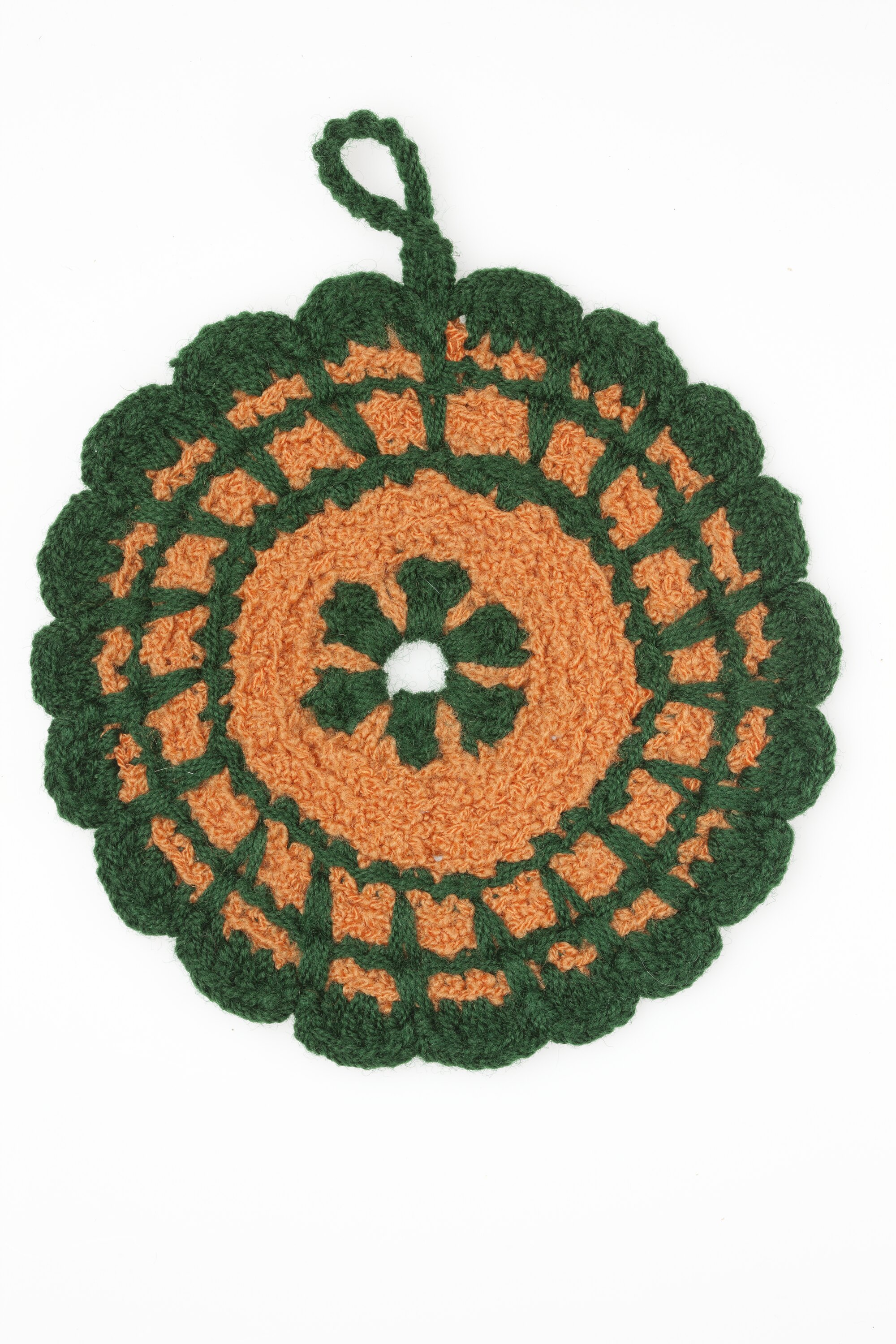 Crotched woollen circular pot holder, with concentric circles in dark green and orange.