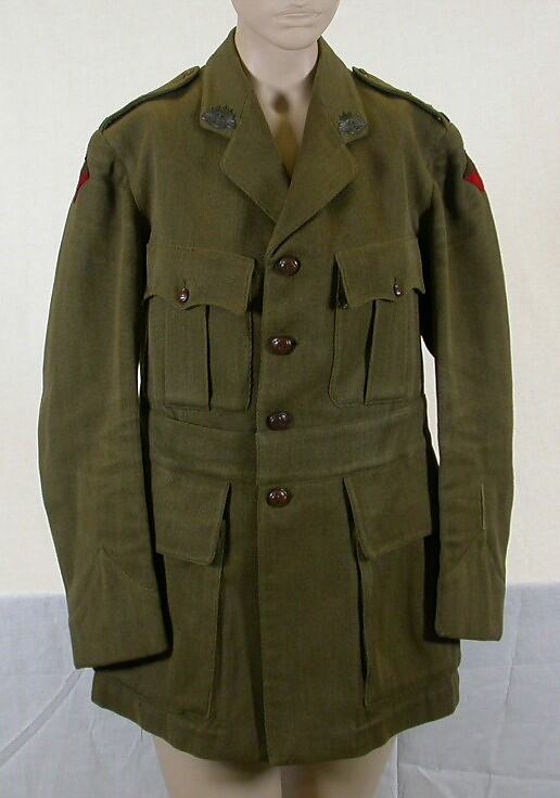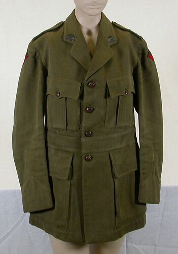 Khaki twill woolen tunic. Two hip pockets with buttoned flaps. Two breast pockets with pleat and three pointed button flaps. Four front buttons and four pocket buttons are leather. Waistband with pocket opening at right front. Two metal belt hooks at the side back. Rising Sun collar badges. Epaulettes with leather buttons and brass 'Australia'. Sleeves with sewn back pointed cuff. Metal wound stripe on left sleeve above cuff. Brown and red colour patch of 23rd Australian Infantry Battalion with brass 'A' on both sleeves below shoulder. Vent at centre back.