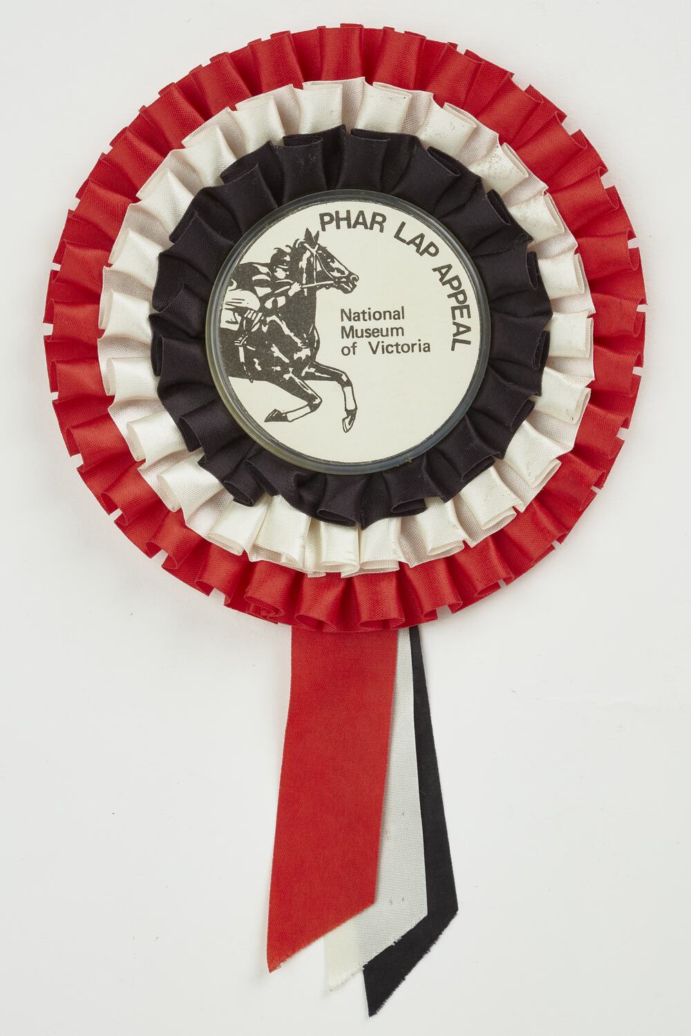 Blue, white and red ribbon rosette produced by Museum Victoria in 1980 to be sold to raise funds for a new display case for Phar Lap, as well as to establish an acquisition fund to buy Phar Lap related objects for the Museum's History Collection.