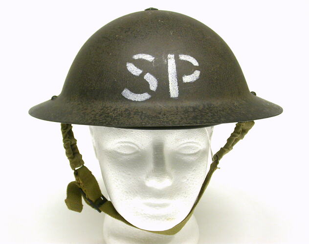 'SP' stencilled in white paint on front and back. Inside helmet brim stamped '7 1/4'.