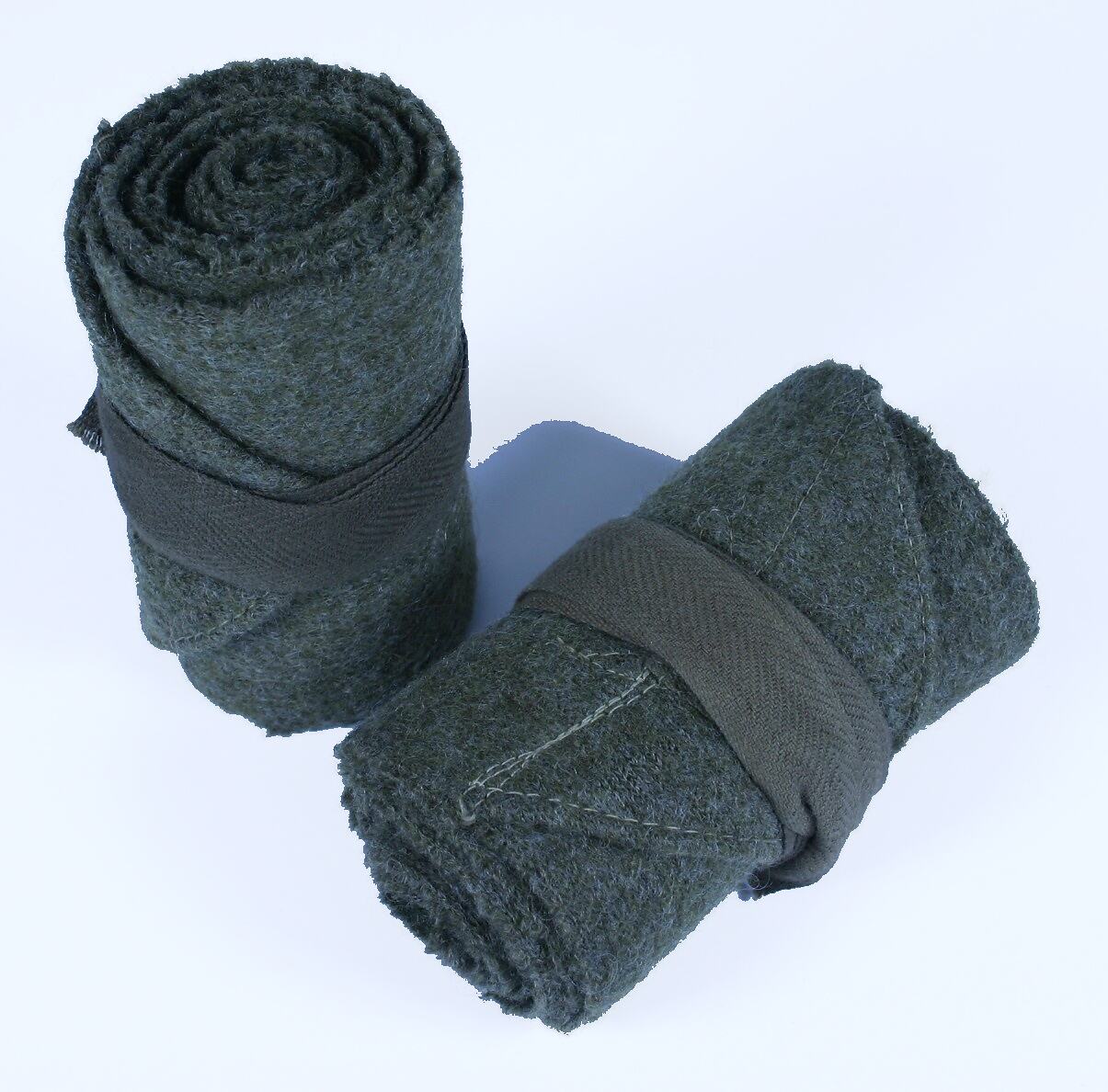 Coarse khaki woollen puttee 11cm wide, mitred at one end, woven selvedge edges, straight pin stitched edge on other end. 2cm cotton tape attached to the pointed end.