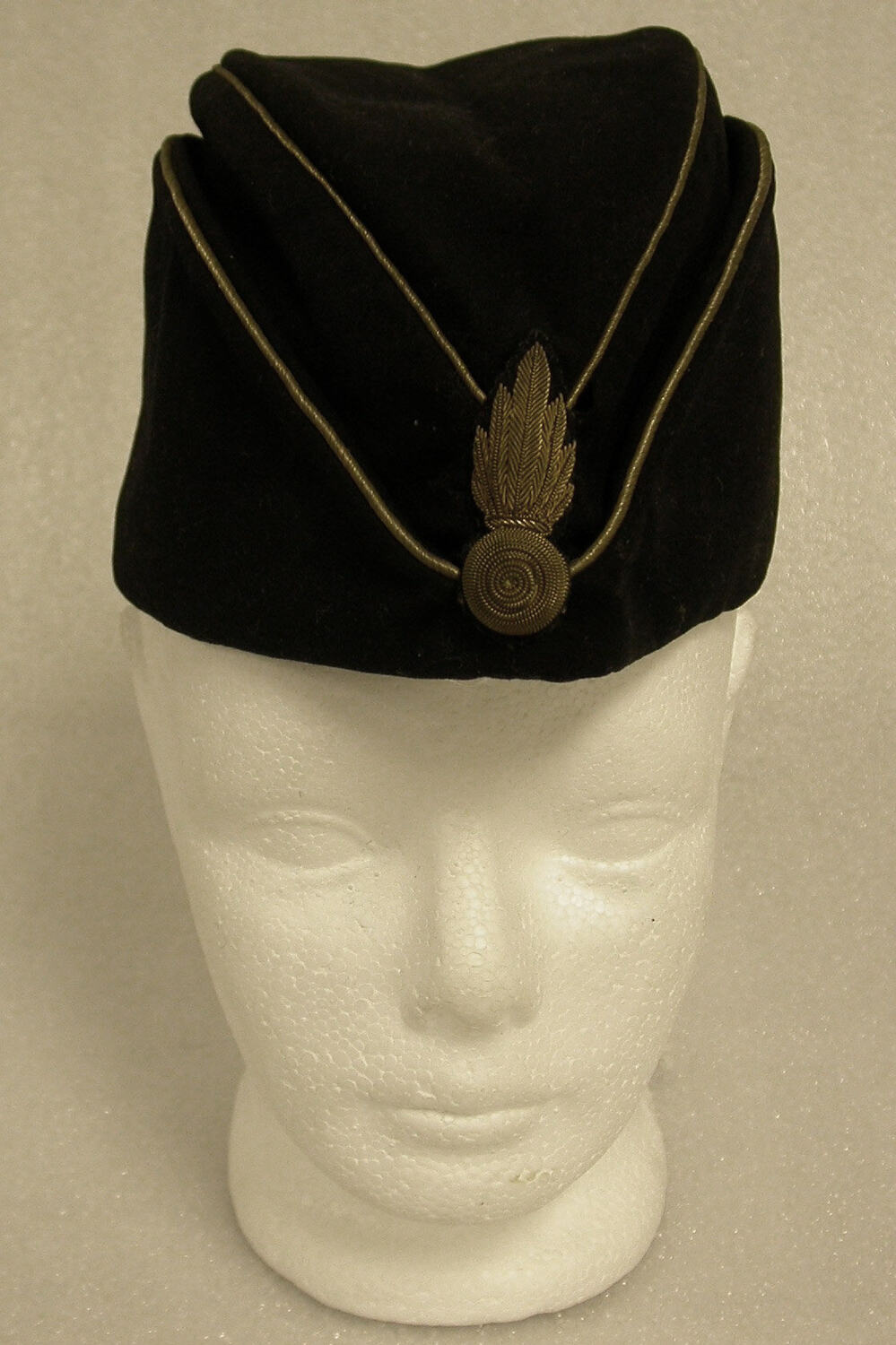 Glengarry style. Black wool with recessed crown, piped with gold cord on the outside. Exploding grenade badge at front. Lined in black satin, with cloth label stitched to crown.
