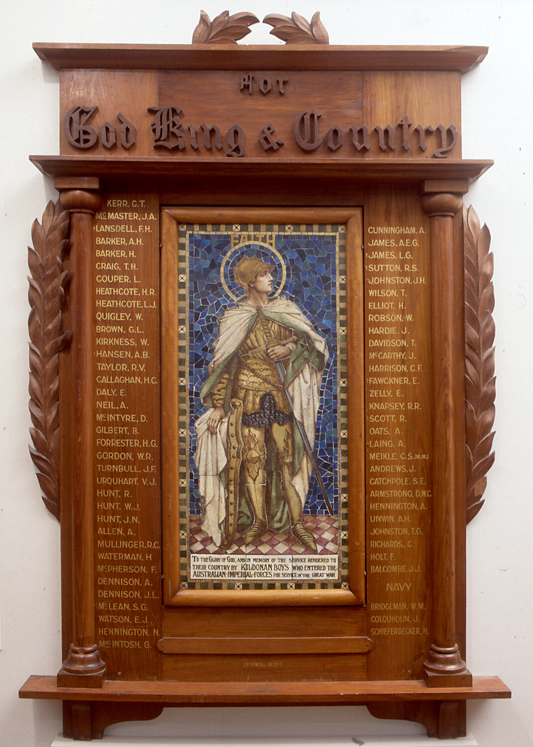 On top: "For/ God King & Country; " In mosaic: "FAITH; TO THE GLORY OF GOD, AND IN MEMORY OF THE SERVICE RENDERED TO / THEIR COUNTRY BY KILDONAN BOYS WHO ENTERED THE / AUSTRALIAN IMPERIAL FORCES FOR SERVICE IN THE GREAT WAR." At base in gold paint: "+ DENOTES KILLED" On left hand side of board: 36 names listed On right side of board: 31 names listed