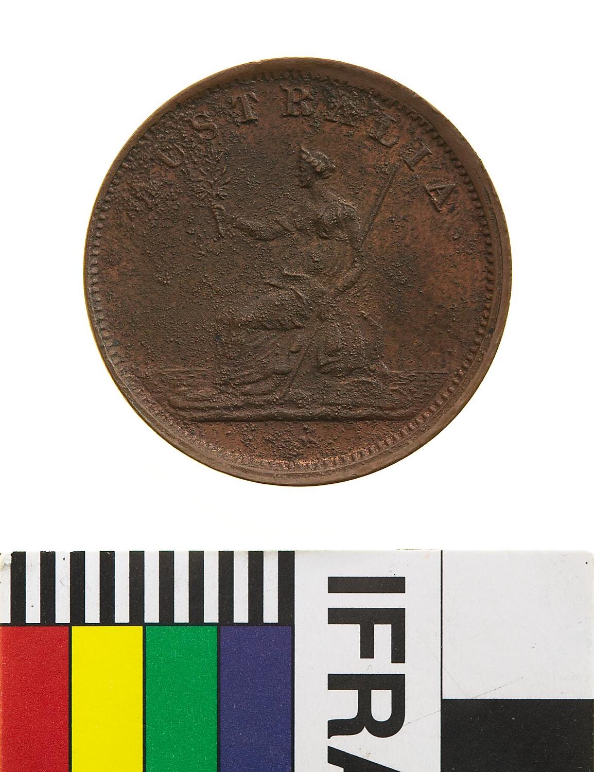 Australia seated l. on rock holding olive branch and wand; above, AUSTRALIA - the die was heavily coroded when employed to strike this piece