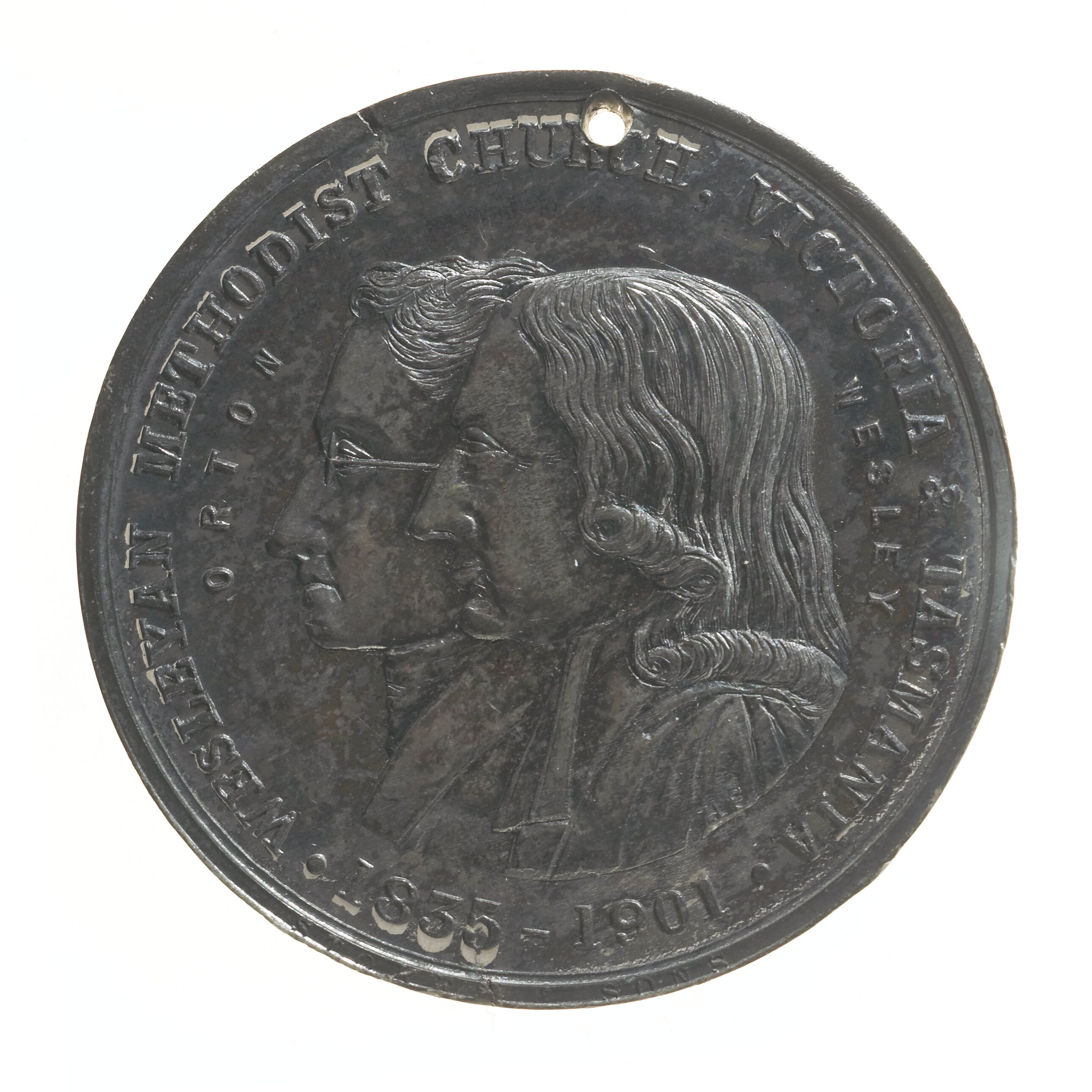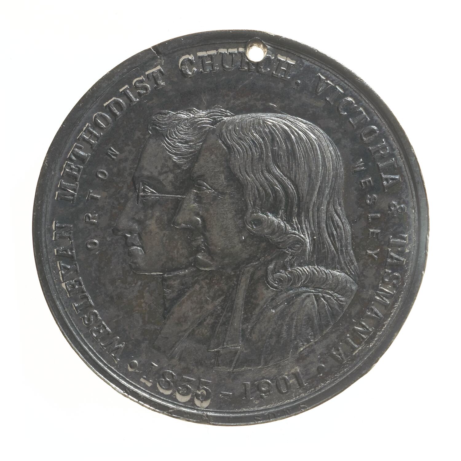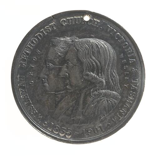Conjoined busts of Orton and Wesley left; around, WESLEYAN METHODIST CHURCH, VICTORIA & TASMANIA. 1835 - 1901. at left, ORTON; at right, WESLEY