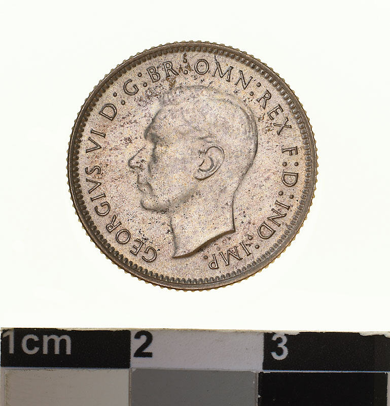 A silver coin (19 mm diameter with milled edge) featuring a bare head of George VI facing left; around, GEORGIVS VI D: G: BR: OMN: REX F. D. IND: IMP. ; below bust in small lettering the artist's initials H.P.. The reverse features the Ensigns Armorial of the Commonwealth of Australia, as authorised by Royal Warrent 7th May 1908 - composed of a simple shield enclosing a cross of Saint George on which are five six-pointed stars, around the outside of which are six small escutcheons, i.e., small shields. The shield is supported by a kangaroo and an emu standing on a grassy mound. Above the shield a crest, the seven-pointed star of Federation on a wreath. Below on a ribbon the motto ADVANCE AUSTRALIA is inscribed. Around above, SIXPENCE and below, between arrow heads, the date, 1945.